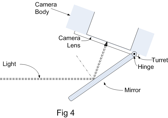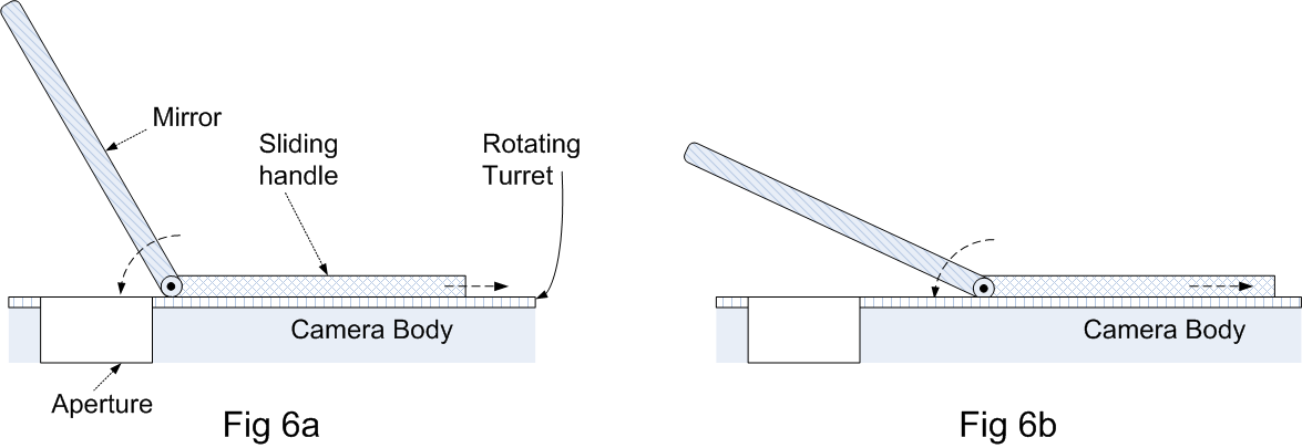 A better design would have the mirror slide out of the way of the camera. The tilt angle would reduce to zero as the mirror is pulled away, thus allowing for tilt adjustment. Figure 6ab and Figure 6cd show a rough depiction of such a design. Figure 6a shows the mirror in the recording position. Figure 6b shows the mirror starting to fold as it is being retracted by its sliding handle. Figure 6d shows the mirror folded and retracted. The sliding parts are mounted on the rotating turret.