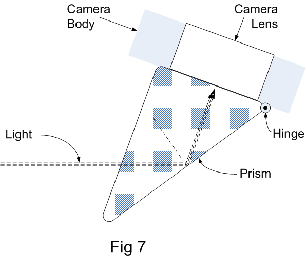 The prism depicted in Figure 7 could be moved out of the camera’s field of vision by swinging it around a hinge. Figure 8 depicts the stowed position. Another problem with this implementation is that the prism cannot be completely removed and will always protrude from the case. Though prisms are sturdier, mirrors seem to be functionally preferable. Besides allowing the tilt angle to be adjustable, the mirror can be cleanly stowed away when it is not needed. The optical quality of a mirror would be better than that of a prism.