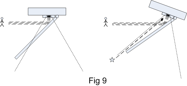 The reflecting surface will need to be large compared to the camera lens. The field of view is a cone with a vertex angle that may exceed 120 degrees for wide-angle cameras. As depicted in Figure 7, a mirror needed to cover the field of view at high tilt angles would have to be very large. An inadequate mirror length is illustrated in Figure 9 (right) and Figure 10 (left.) Undesired light from the star shaped object would be captured in the photograph. Ideally, only reflected light should enter the camera. A solution could be to place a convex lens close to the camera to reduce the camera’s angle of view, as shown in Figure 10 (right.)