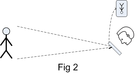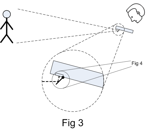 Figure 2 depicts the current proposal being used for a portrait mode recording. The mirror has been deployed allowing the mobile phone to be held in a more comfortable position. The scene being recorded would be ahead of the photographer. The inset depicts the image on the mobile phone’s display. Note that the image would be inverted due to the mirror. This can be corrected by software on the mobile phone.