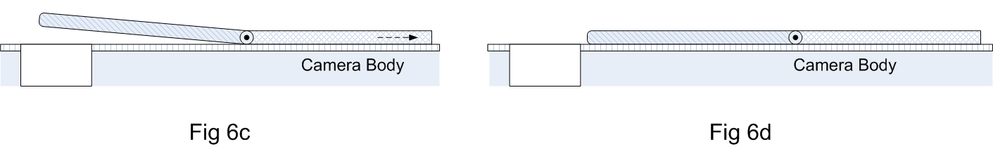 The mirror should be completely retractable to allow recording in the original mode. It should be minimally obstructive while retracted, ideally stowed flat along the camera body. There are several designs to meet this requirement. The hinge can allow the mirror to flip back completely, as shown in Figure 5. The downside here is that the reflecting surface of the mirror will be left exposed and unprotected.