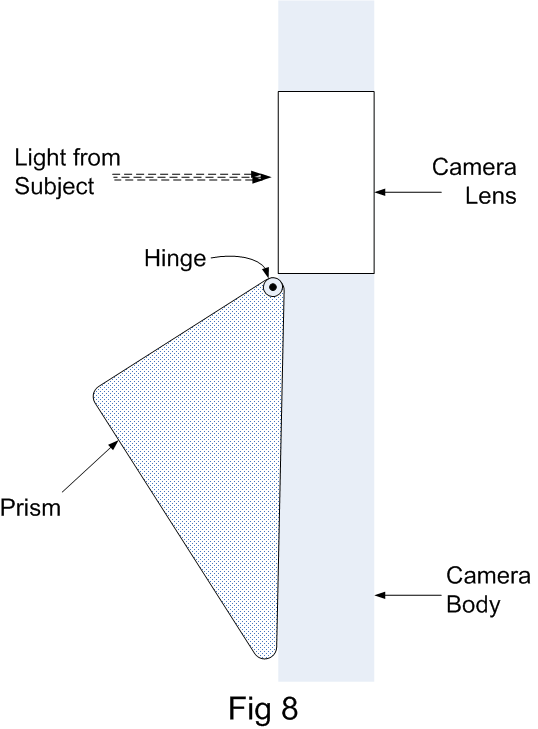 The prism depicted in Figure 7 could be moved out of the camera’s field of vision by swinging it around a hinge. Figure 8 depicts the stowed position. Another problem with this implementation is that the prism cannot be completely removed and will always protrude from the case. Though prisms are sturdier, mirrors seem to be functionally preferable. Besides allowing the tilt angle to be adjustable, the mirror can be cleanly stowed away when it is not needed. The optical quality of a mirror would be better than that of a prism.
