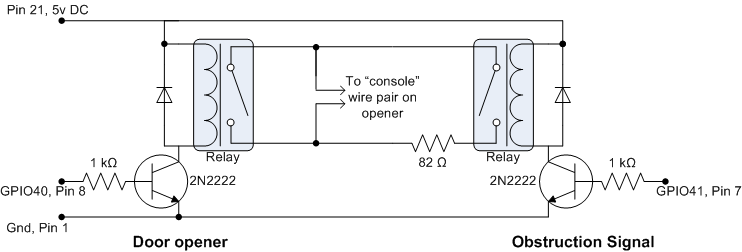 The red LED in the Wall Console button was an obvious choice for the Stop light. According to the Wall Console circuit, the LED can be turned on and off by placing an 82 ohm resistor across the console wire pair. The Garage Minder already had access to these wires. Next, we need to filter the wave from the obstruction sensor to yield a useful TTL signal. To shape the wave, a 0.1uF capacitor eliminates the DC offset. The diode blocks the negative spike. The 4.7uF capacitor acts as a charge tank and the 82K resistor drains the tank. The resulting signal is suitable for the processor; it is high (2.7v) while there is no obstruction and low when there is an obstruction and no AC waves. When the signal is low, then a relay triggered causing the red LED "Stop light" to come on.
