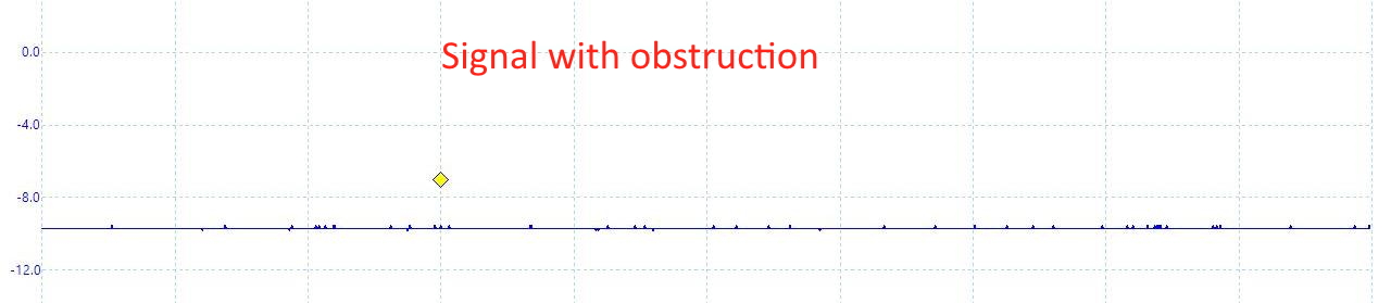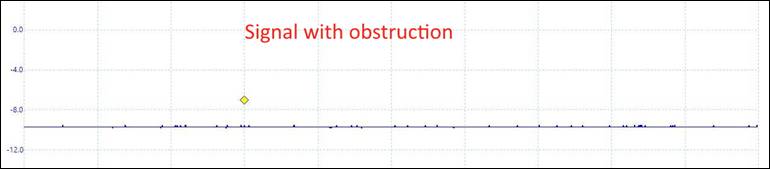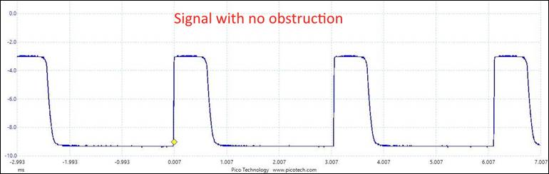 In the wave form shown above (Signal with no obstruction), note that the upward trace is much steeper than the downward line. This causes a higher spike through the 0.1uF capacitor, thus avoiding the need to amplify the resulting output with a transistor.