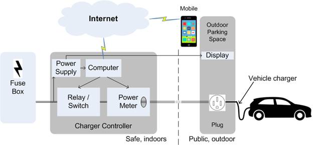 1. In today's cities, vandalism is the main risk. Any loose charging equipment is likely to be stolen. Besides theft, there are miscreants who would find it amusing to damage the installation. It would be best to keep the equipment concealed and not advertize their presence. The design keeps most of the sensitive parts indoors. The outdoor parts are limited to the NEMA power socket, an inexpensive computer that supports Bluetooth and an optional display.