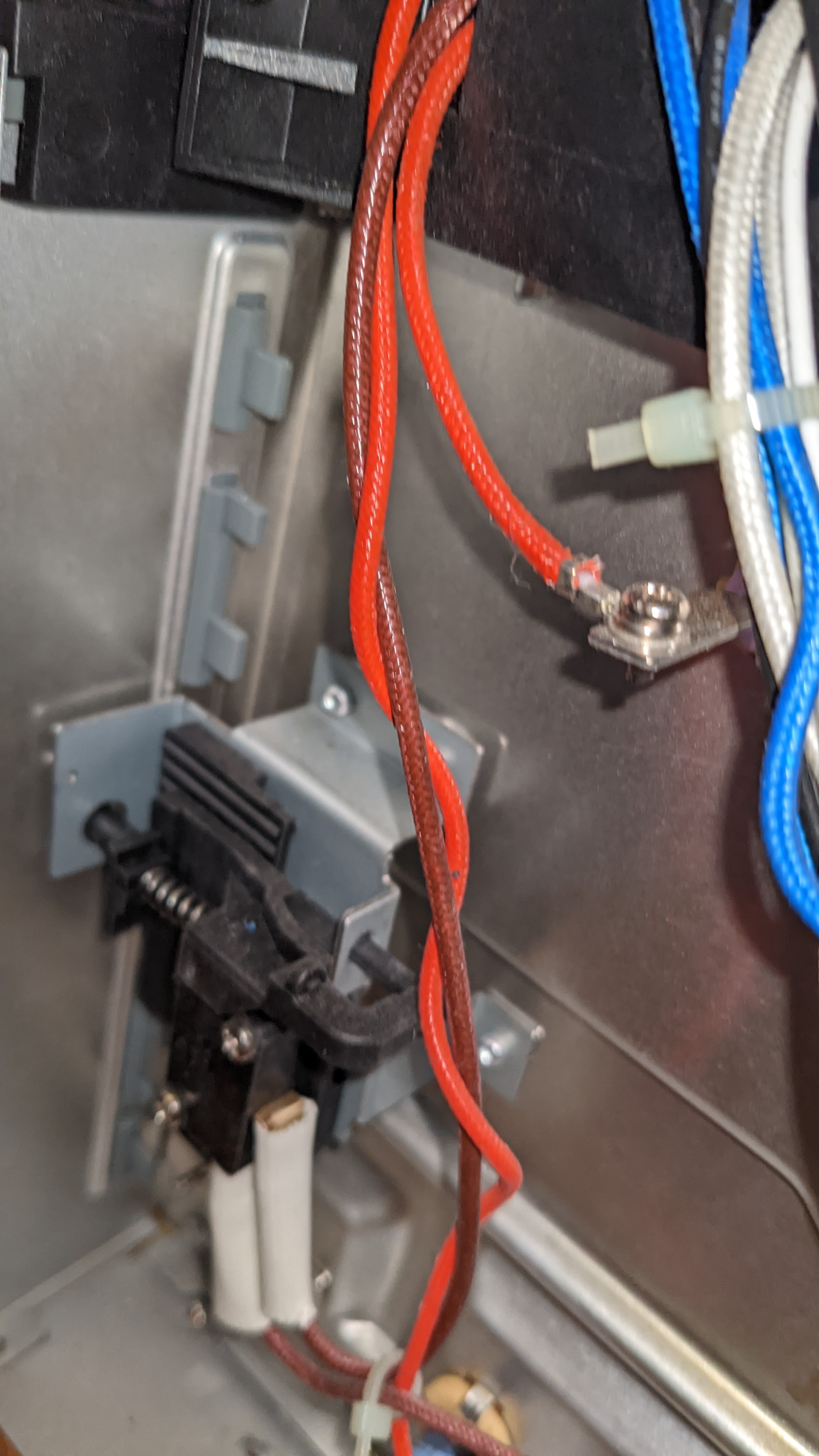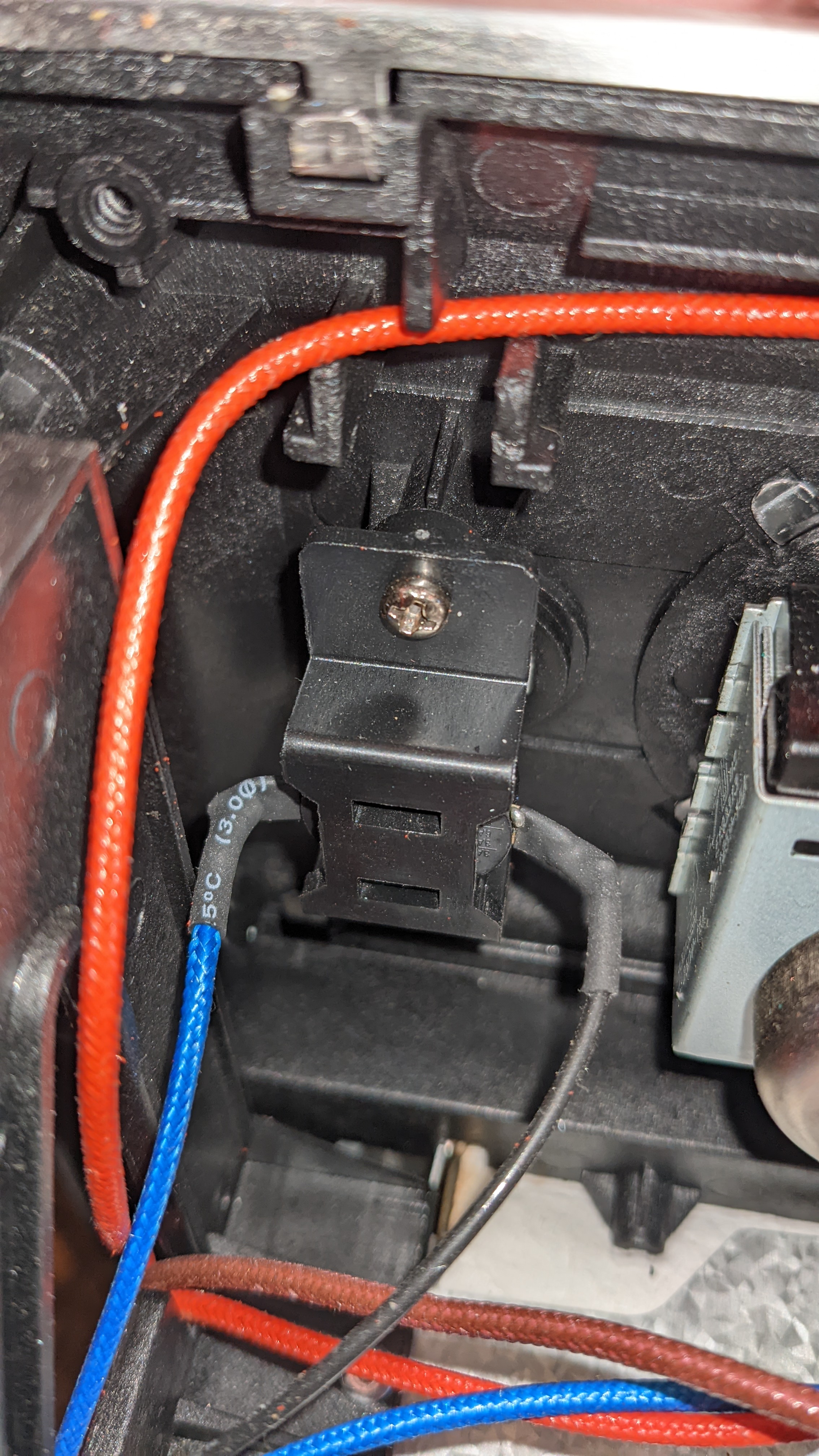 The red, white and blue colors of the wires seem to be chosen without a strategy. Tracing the spaghetti reveals the following schematic. Personally, I would have placed the thermostat along the wire marked "Timer gated power", allowing the heater elements to be grounded directly to neutral. But no big deal. The Microtemp thermal fuse is rated to blow at a specific temperature (marked 216°C, 420°F).