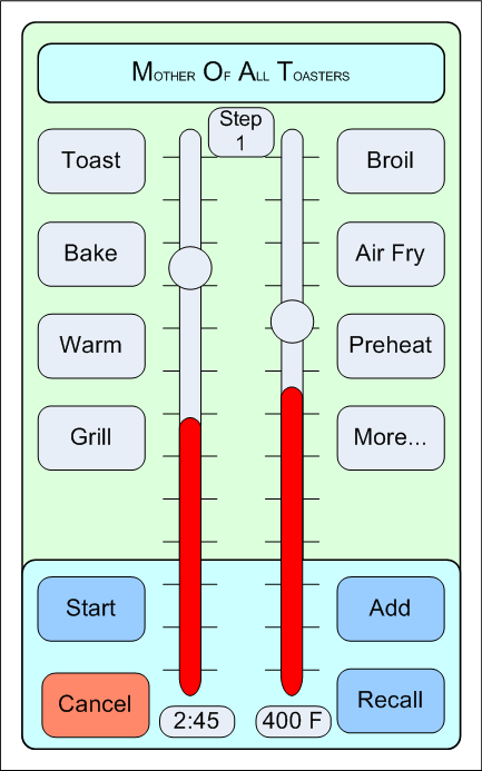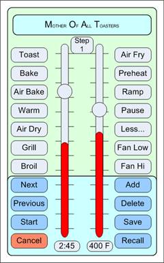 The toaster can be operated in ‘compatible’ mode by manually turning on either of the two dial timers. This will start the oven or the broiler at the temperature set on the dial thermostat. The oven light will come on while the timer is active. The light button has been repurposed to control the fan. Double clicking this button will run the fan at High. The GUI based functions described below are enabled when the manual timers are not engaged. Turning on a timer while another function is running will set off a dreadful alarm. In this mode, the dial thermostat tells the software when to turn the heater elements on and off. This reproduces the original behavior and continues to be bad.