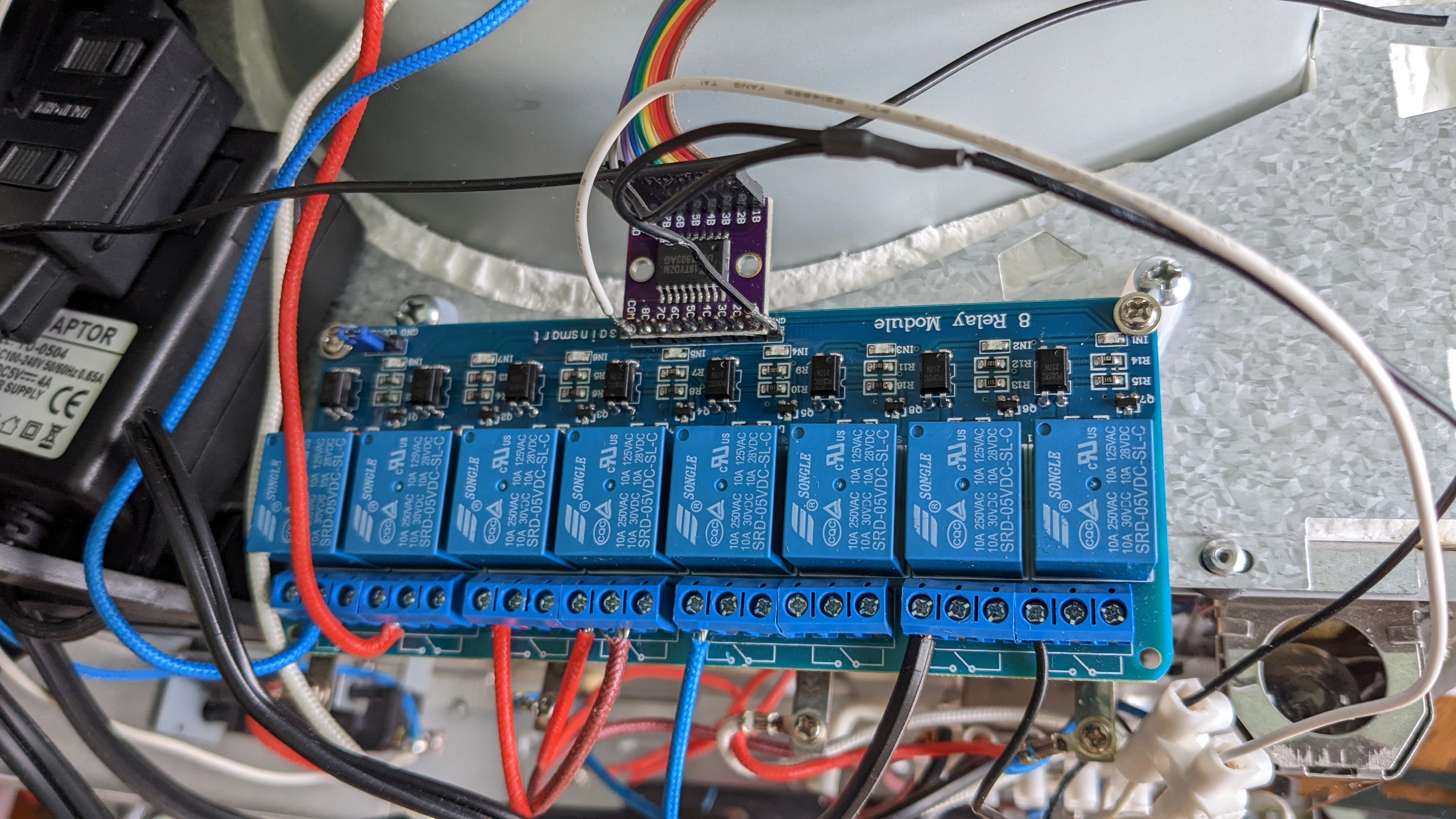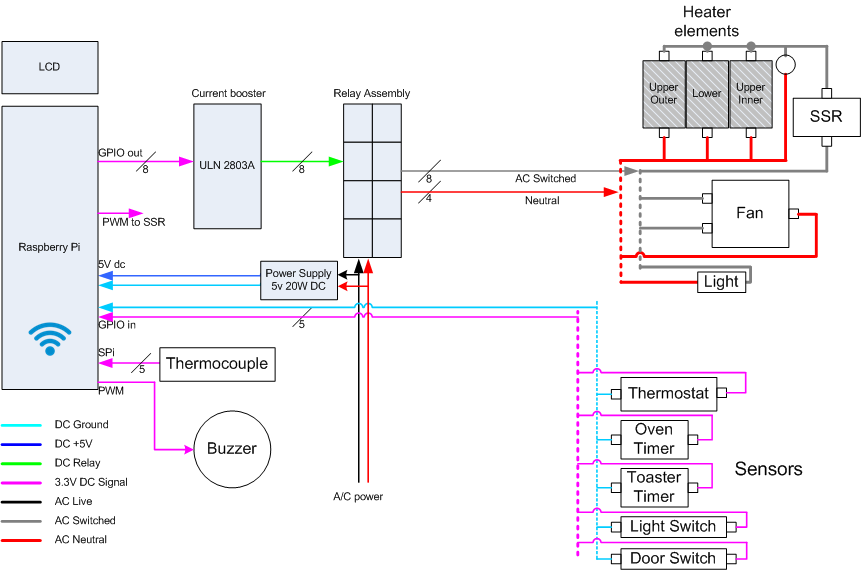 At a high level, a Raspberry Pi Zero 1 W uses 8 of its GPIO pins to control 8 relays. The relays drive the toaster's three heater elements, fan and lights. Besides turning on each element at full power, the relays can also configure them in series to allow for gentle warming. Five other GPIO pins are used to sense the state of timers, thermostat and switches. Three more GPIO pins for the thermometer. A web server on the Pi listens for commands via Wi-Fi. It also drives an LCD screen and serves up REST APIs for basic commands.