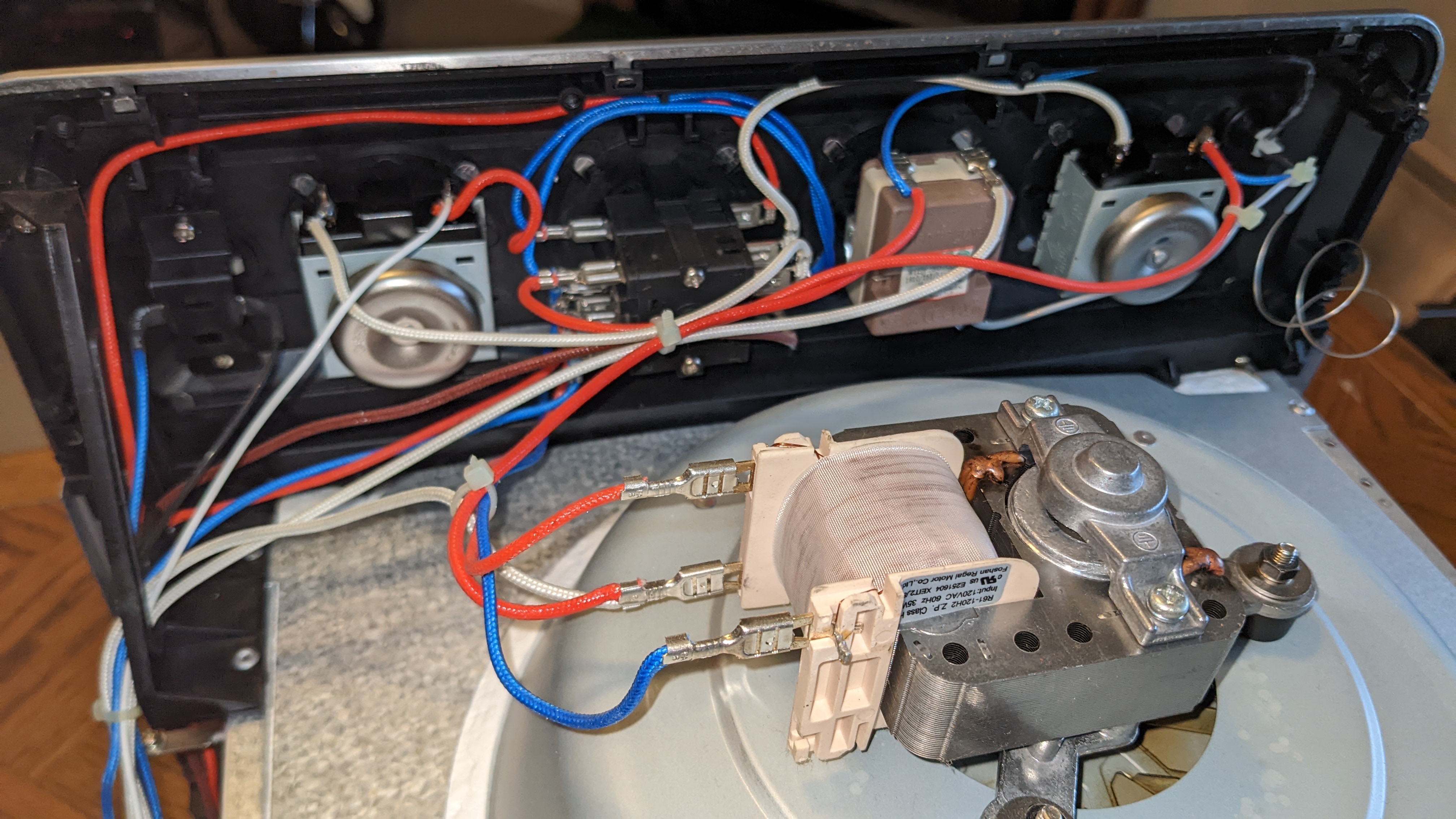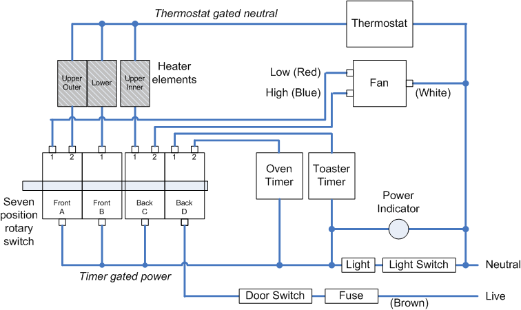 The following table shows its connectivity. There are 4 inputs: A, B, C and D. There are 7 outputs: A1, A2, B1, C1, C2, D1 & D2. The check marks indicate if the input is connected to the output at that position. Heater elements are in red, fans are blue, timers are black. For example, in the position Toast (position 4), input A connects to both A1 &A2, input B connects to B1, and input D connects to D2. This effectively turns on A1 (fan in low), A2 (upper outer heating element), B1 (lower heating element) and D2 (engages the toaster timer). The 'Warm' setting activates the lower heater element. Interestingly, 'Bake' & 'Toast' are identical, as are 'Broil w/fan' & 'Air-fry'.