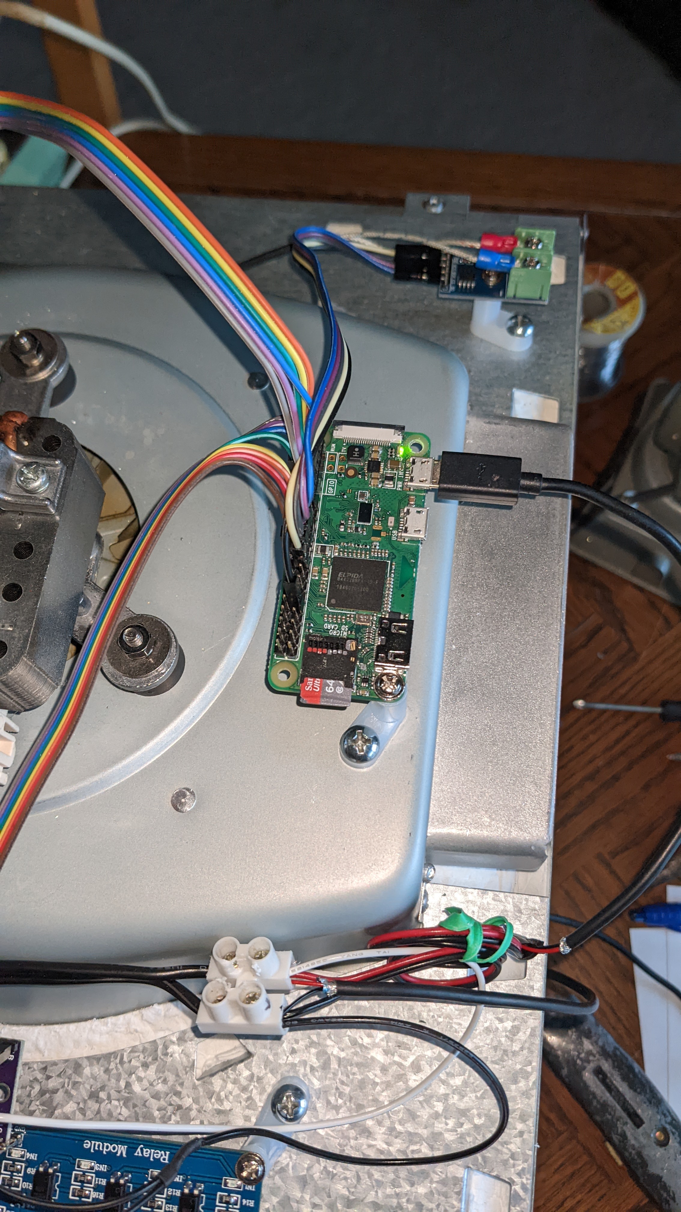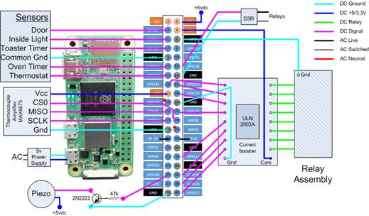 The low voltage section for sensors is wired separately. A 5 Vdc power supply is added inside the toaster shell. The Raspberry Pi is installed on the fan housing. The metal oven outer casing will be replaced to avoid blocking WiFi signals and to allow better cooling for the new components. It will also show off the cool tech. Ribbon cables connect the Pi to relays and sensors.