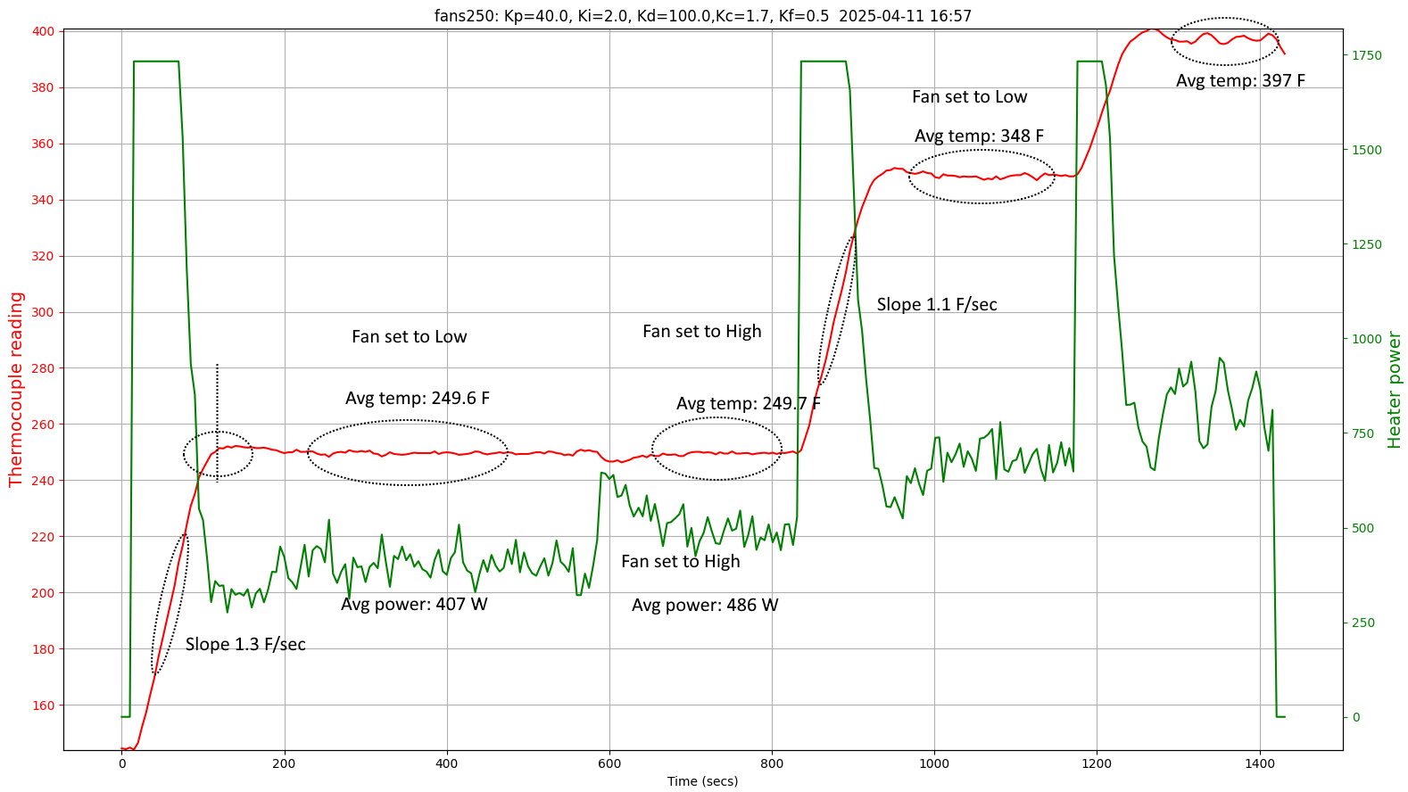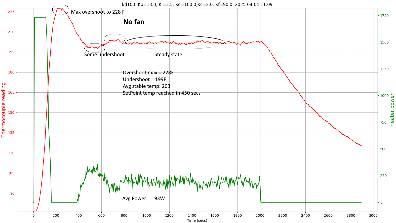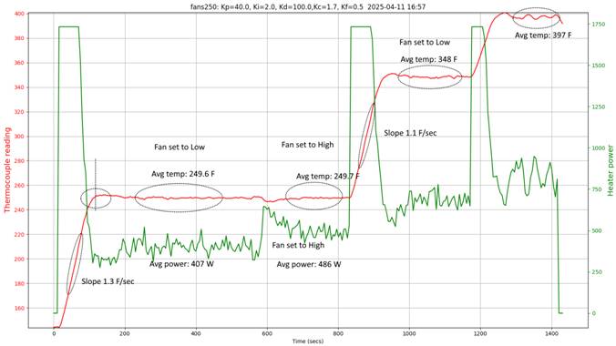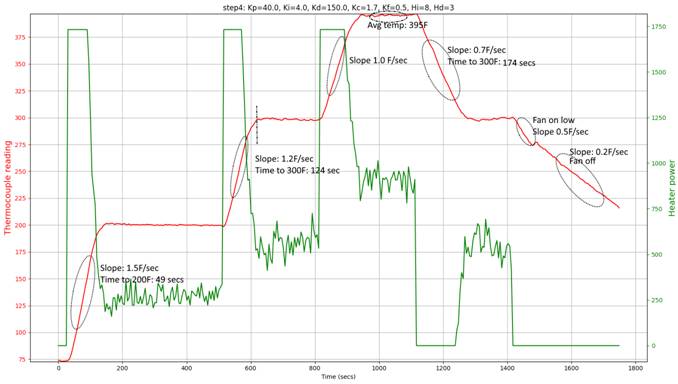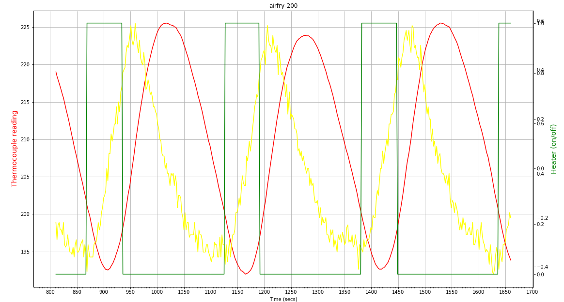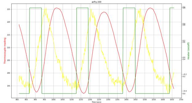 · The following graph illustrates this. The oven is already warm and is maintaining the set point of 200°F. The green plot is the heater element turning on and off, and the red plot is the thermocouple reading. The heater goes on at about the 865 sec mark, but the reading is still dropping. The reading starts to rise around the 910 sec mark. The heater goes off at the 940 sec mark, but the reading continues to increase till the 1020 sec mark. Again, this measurement used the thermocouple for temperature control. Note that the average temperature is higher than the expected 200°F and the range is between 190 to 225°F.