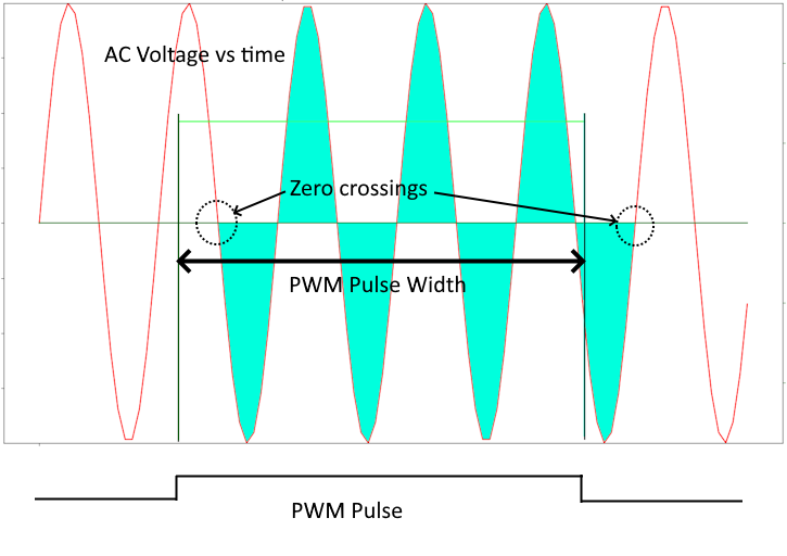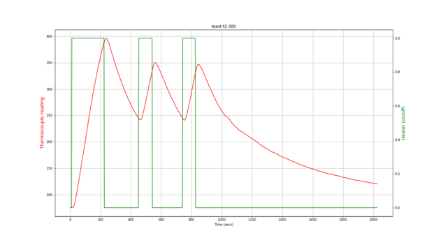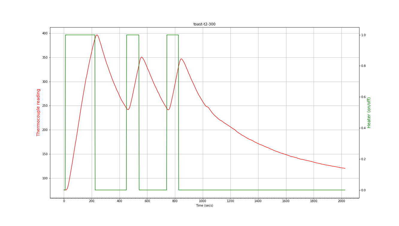 The original toaster uses a thermostat. This is a mechanical device that consists of a dial to select the desired temperature, a temperature sensor and an on/off switch. Its job is to control power to the heater elements so that the oven reaches and maintains at the desired temperature setting. The following graph shows its operation at a set point of 300°F. The red line displays the actual temperature swinging between 250° and 400°F. The green trace shows the heater elements coming on and off. While the average temperature is 300°F, the temperature swings are excessive and lead to food getting burnt.