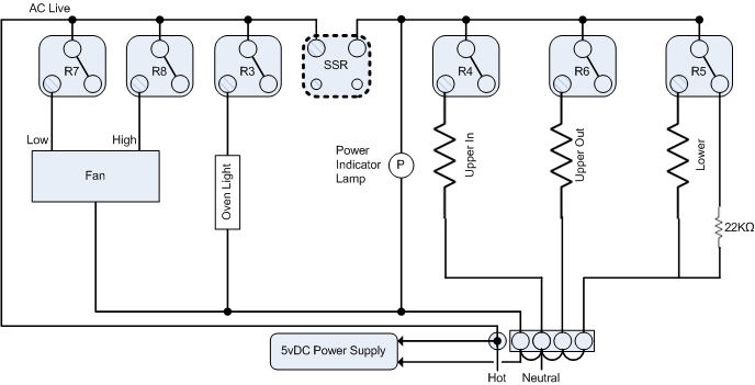 The relays were initially wired as shown below. Two of the relays (R1 & R2) were used to string heater elements in series. This allowed for heating with lower wattages. The table below shows the power and relay settings for each element combination. There are 11 combinations, of which 4 are suitable for broiling. However, this element chaining feature was not sufficiently effective, and there was a lot of relay clicking.