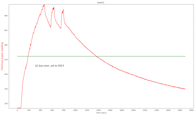 The wild temperature swings seem to be common for most retail products. Here is a plot from our new LG gas fired oven set to 350°F; it seems to swing between 350 to 450°F. I wonder how commercial ovens fare.